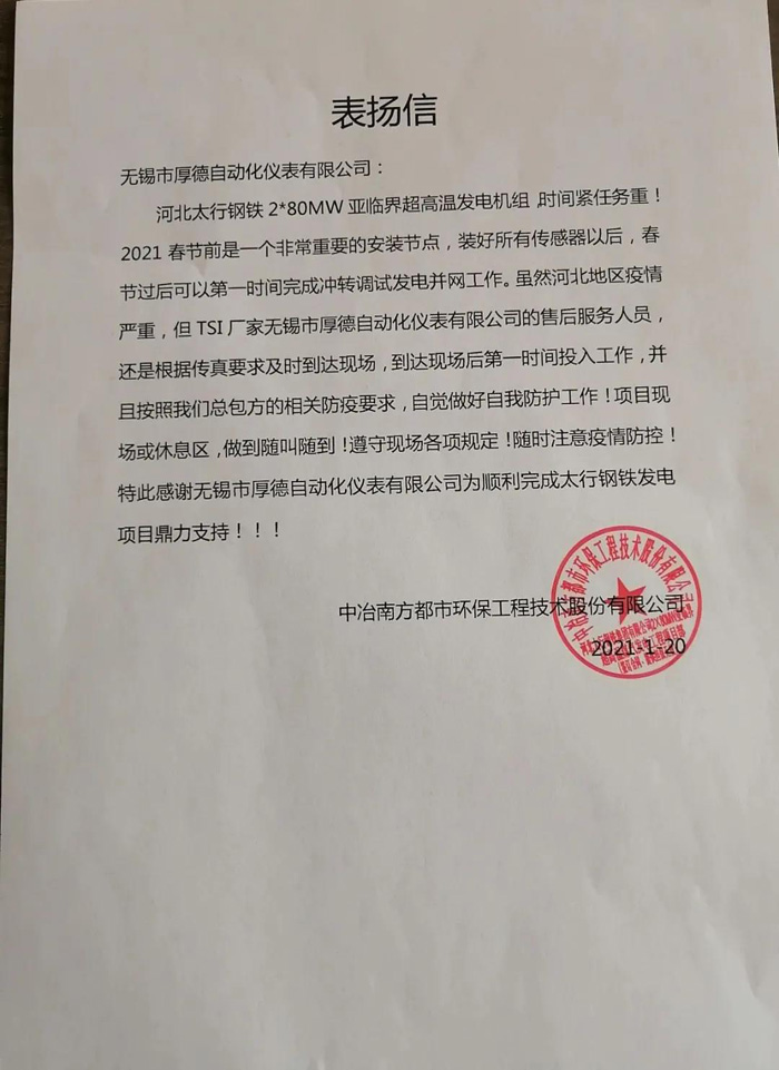 用戶特意為我公司此次逆行服務人員吳志鵬發來一封表揚信,感謝我公司為順利完成太行鋼鐵發電項目的支持。客戶熱情的贊美,溫暖了這個寒冷的冬天,也溫暖了我公司全體員工的心。