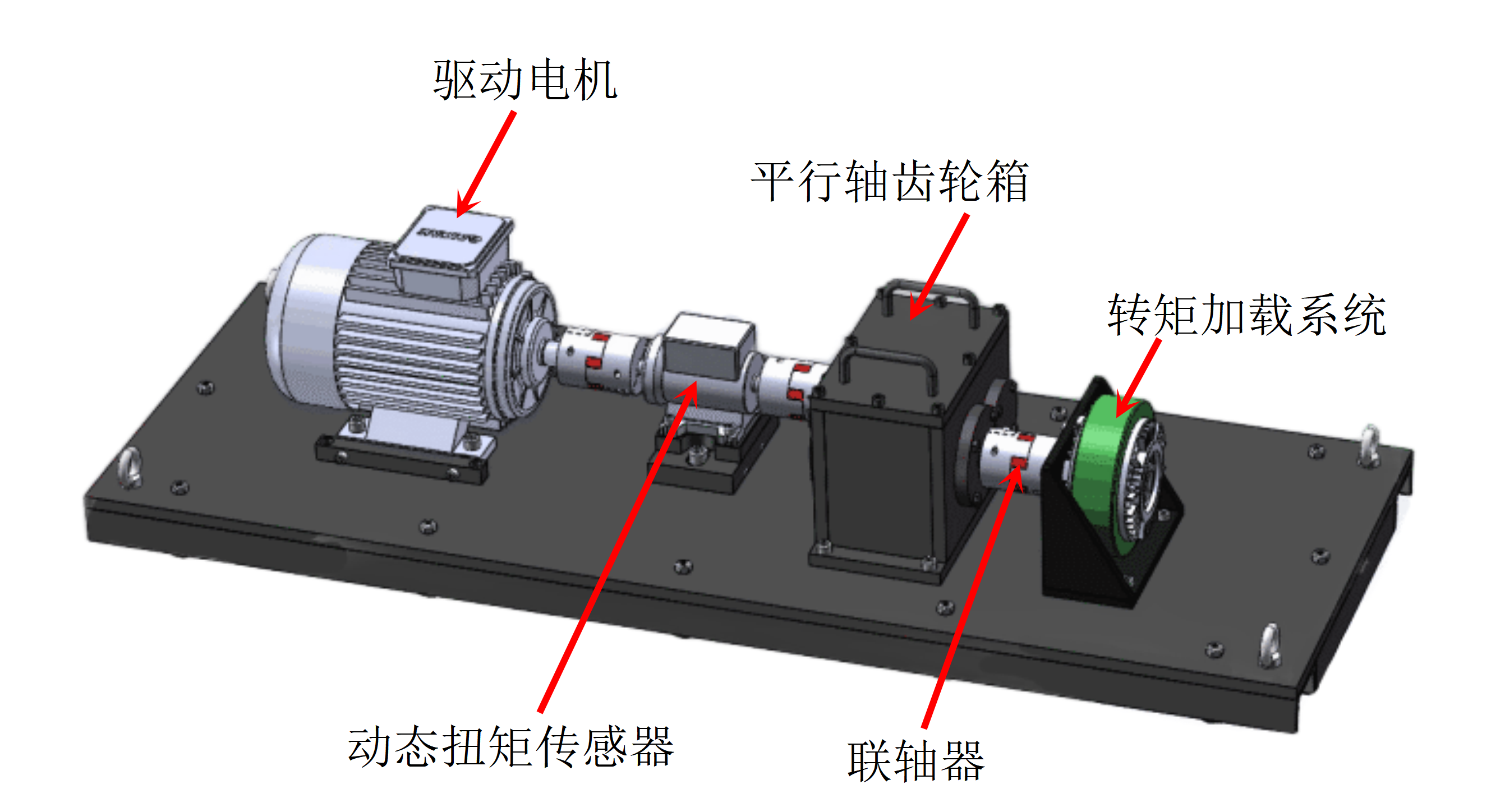 本實驗系統由平臺底板、三相變頻電機、動態扭矩傳感器、平行軸齒輪箱、轉矩加載系統、聯軸器、循環冷卻系統、試驗臺控制系統組成。整體設備尺寸為1400mm×500mm×330mm。