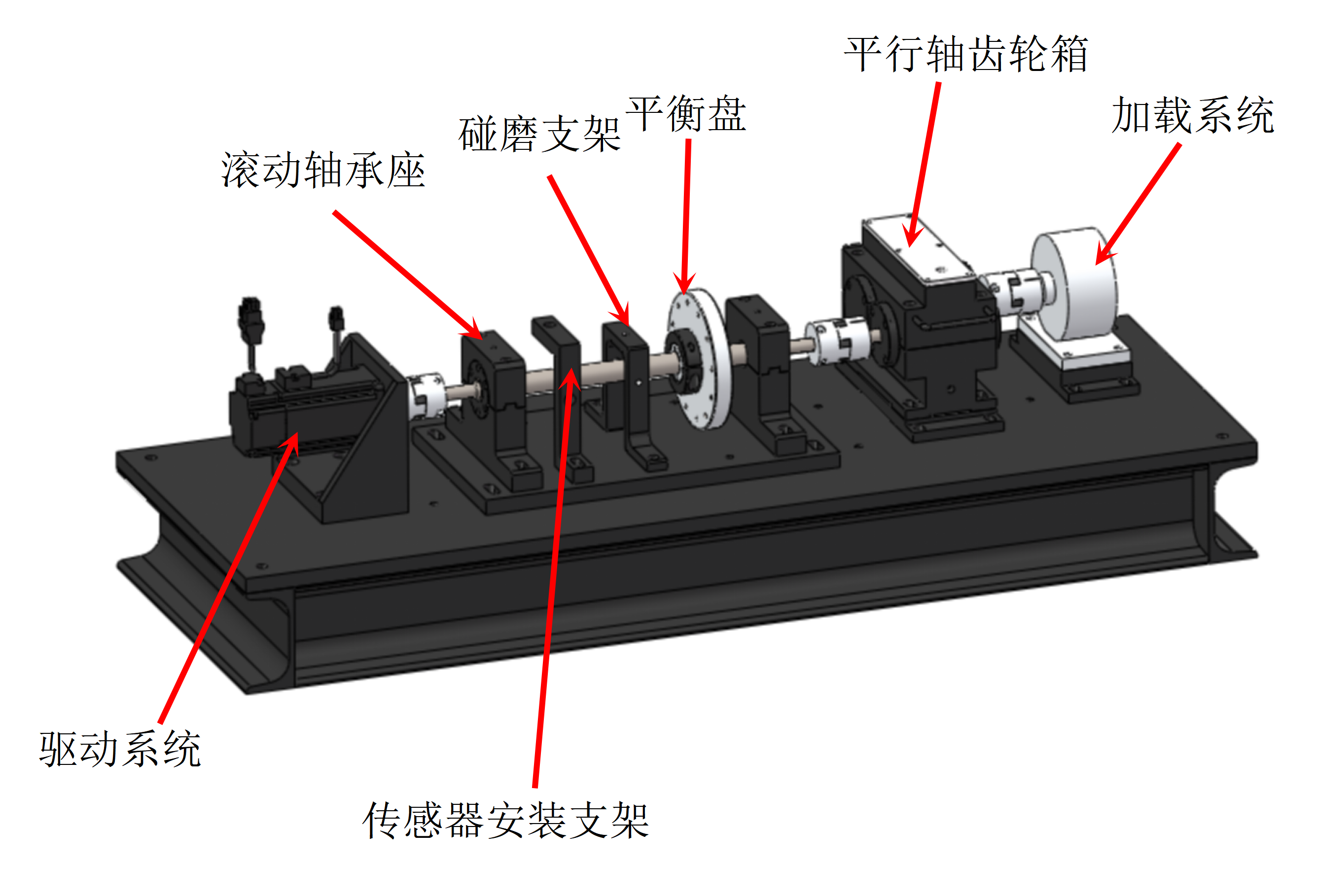 本實驗系統由伺服電機、轉子系統、傳感器安裝支架、聯軸器、平行軸齒輪箱、轉矩加載系統、平臺底板、試驗臺控制系統等組成。整體設備尺寸為1000mm×350mm×365mm。